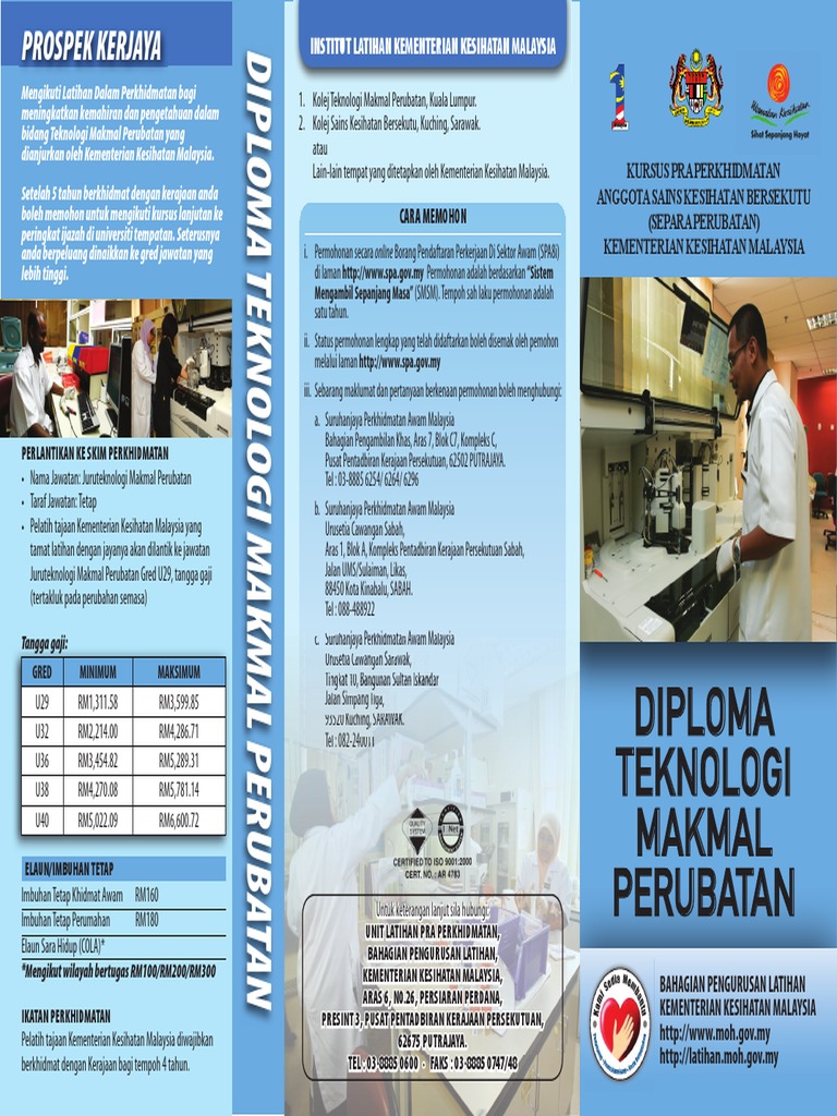 Pegawai farmaseutikal medical underwriter di syarikat insurans eksekutif perhubungan perubatan eksekutif jualan instrumen/ bahan kimia penyelidikan & diagnostik usahawan dan wartawan kesihatan. Program ini akan membiasakan pelajar dengan pelbagai subjek ilmiah seperti biokimia, biologi. Bagi calon diploma teknologi makmal perubatan anda mesti mendapat kepujian dalam dua subjek sains tulen terutama kimia & biologi. Diploma in medical laboratory technologi/teknologi makmal perubatan. Kolej teknologi makmal perubatan, kuala lumpur. Juruteknologi makmal perubatan gred u29, tangga gaji. Hopefully menda ni mebantu la ye. The faculty is offering diploma in pharmacy, diploma in medical to connect with diploma pembantu perubatan, join facebook today. Pusat perubatan universiti malaya dan fakulti perubatan universiti malaya. Tmp memberikan khidmatan bantuan penting bagi penjagaan pesakit di hospital. Berikut kami kongsikan butiran mengenai permohona diploma pppum 2018 ini kepad anda. Tarikh permohonan diploma ppum 2018 dibuka. 3 tahun (6 semester) meliputi subjek seperti berikut:
