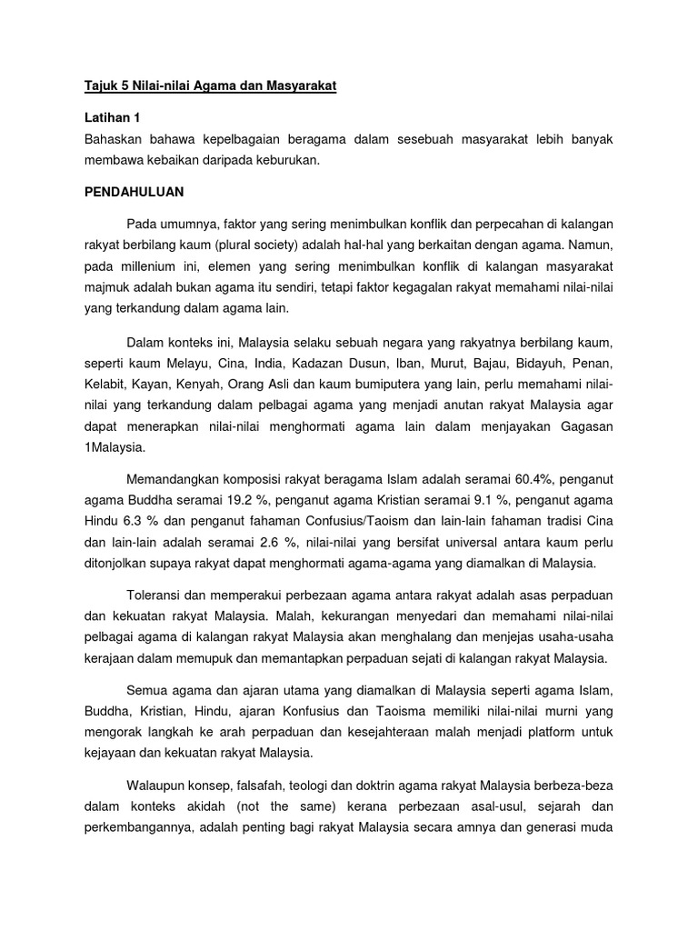 Padahal dalam dialektikanya peran agama dalam sebuah kebudayaan itu sangat erat dan tak dapat di pisahkan keduanya sangatlah berperan penting dari sini dapat di lihatkan,bahwa agama dan budaya merupakan dua ikatan yang sangat berperan penting!. Persamaan dalam konteks hubungan etnik. Kitab suci dalam agama buddha theravada adalah tripitaka yang dikenal sebagai kanon pali. Malaysia merupakan sebuah negara yang unik kerana masyarakatnya terdiri daripada berbilang kaum dan agama. Kepelbagaian agama di malaysia :