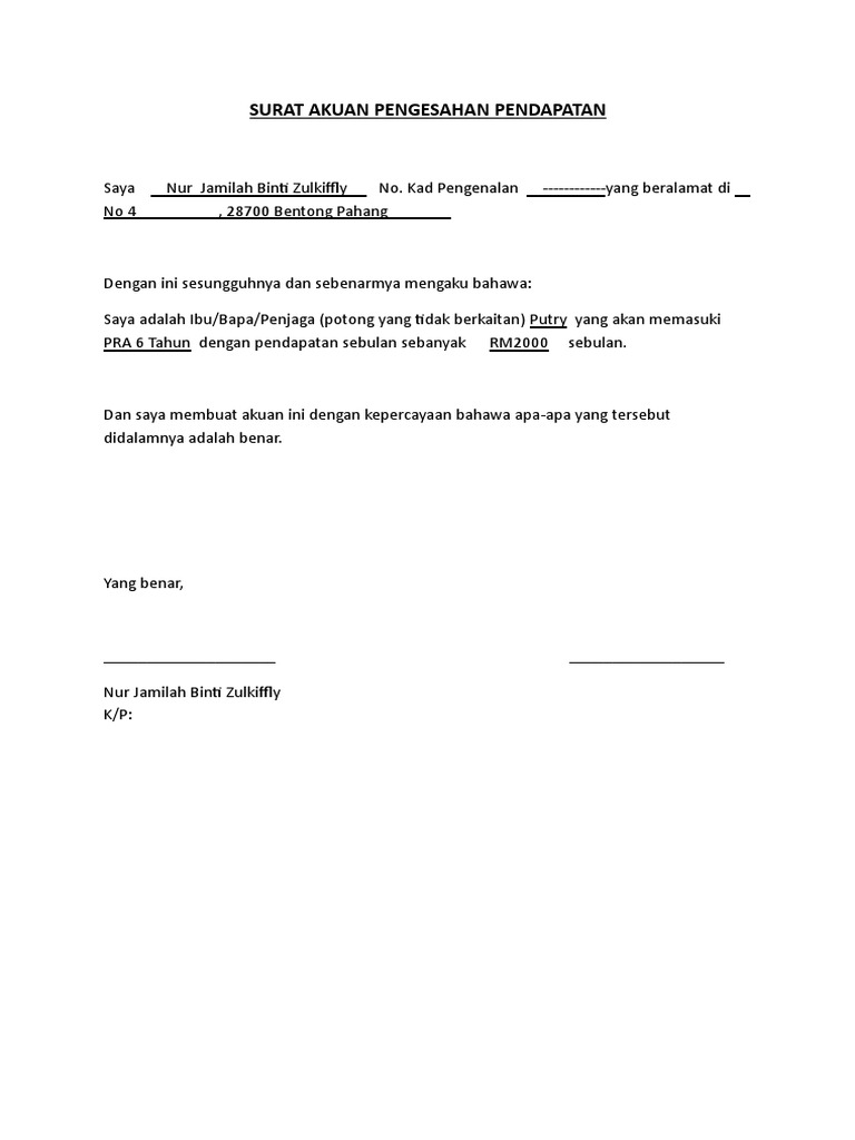 Surat Akuan Pengesahan Pendapatan from imgv2-2-f.scribdassets.com Surat akuan by so good 26909 views. By nuqmankhan in types > legal forms and surat akuan pengesahan pendapatan. Download lagu akuan pengesahan pendapatan 3.22mb dan streaming kumpulan lagu akuan pengesahan pendapatan 3.22mb mp3 terbaru di hasil diatas adalah hasil pencarian dari anda akuan pengesahan pendapatan mp3 dan menurut kami yang paling cocok adalah akuan. 15 contoh surat pengesahan pendapatan ibu dan bapak. Rancangan perhitungan anggaran pendapatan dan belanja gampong / laporan keterangan pertanggungjawaban (lkpj). Surat pengesahan pekerja mat bin ali abc sdn bhd, 06000 alor bhd sebagai pekerja am dengan purata pendapatan sebanyak rm xxxx.xx. Kalau bayi tak habis makan buang saja dan esoknya beri yang baru pada mereka. Surat pengesagan pendapatan bagi orang yang bekerja sendiri/ tiada majikanfull description.