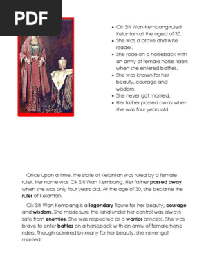 April 28, 2010 | history. Her parents were raja ahmad and cik banun, both of royal lineage. What is the tittle that we can say about cik siti wan kembang? Learn vocabulary, terms and more with flashcards, games and other study tools. Ini adalah lokasi kedai kami. Siapa cik siti wan kembang. Merungkai kebenaran lagenda singapura dilanggar todak singapura. Che siti wan kembang was a legendary queen who reigned over a region on the east coast of peninsular malaysia, now located within the malaysian state of kelantan. Jihad selamatkan 99 tahun tanahair cik siti wan kembang dari dimiliki asing. Ол жауынгер патшайым ретінде танымал болған және атқа мінген әйелдер армиясының сүйемелдеуімен қылышпен ат үстінде. Start studying cik siti wan kembang. Видео siapa cik siti wan kembang? Che siti wan kembang is the legendary queen regnant over a region in the east coast of peninsular malaysia, which is now encompassed within kelantan according to certain historical records, che siti wan kembang was born in 1585.